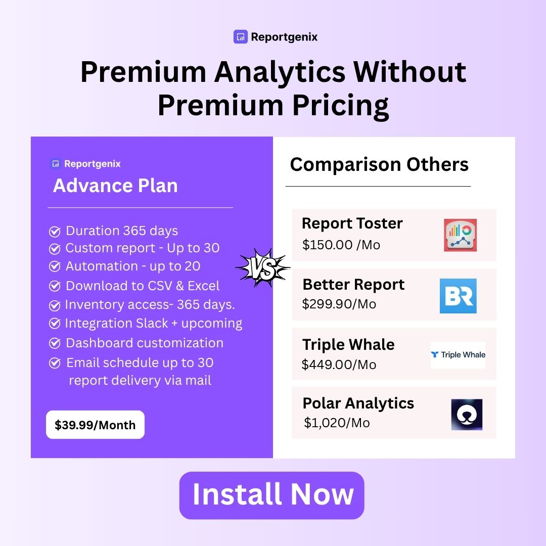 Reportgenix delivers enterprise-grade Shopify analytics apps features at friendly pricing. With its Genix AI assistant providing intelligent predictions and automated insights, it’s perfect for merchants wanting powerful analytics without complexity. What sets Reportgenix apart is combines the depth of expensive enterprise tools with the simplicity of basic apps, striking a perfect balance that works for stores doing $5,000 to $5 million monthly. While competitors charge $300 to $700+ for similar capabilities, Reportgenix starts at just $19.99/month, democratizing access to professional analytics that were previously reserved for big-budget operations. For a detailed comparison of how Reportgenix stacks up against other popular options, check our Reportgenix vs Better Reports Comparison, which breaks down features, pricing, and real-world performance differences.