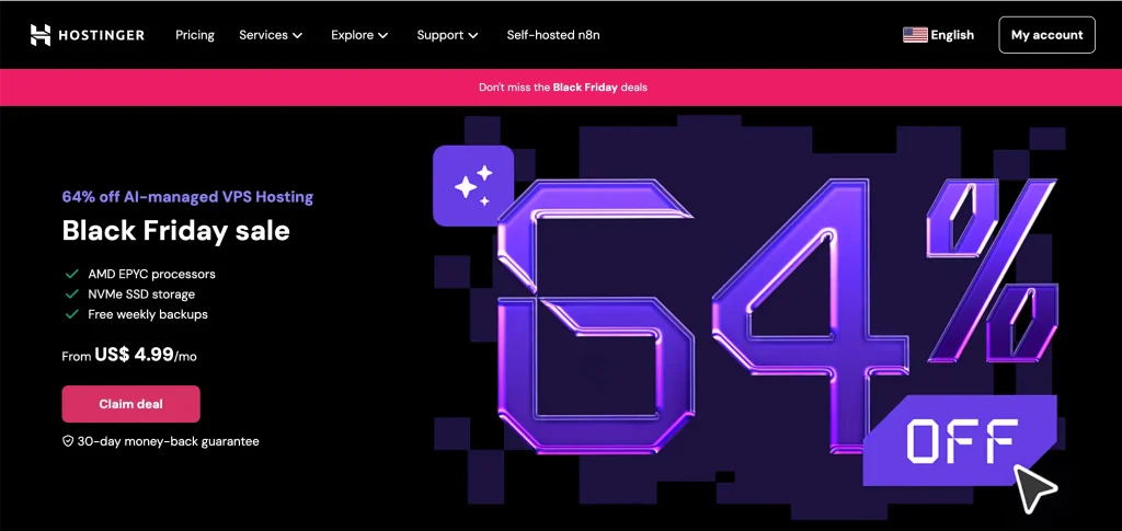 Hostinger VPS | $17.99/mo | $6.49/mo | 64% OFF | Beginners | 2 vCPU cores 8 GB RAM 100 GB NVMe disk space 8TB bandwidth |