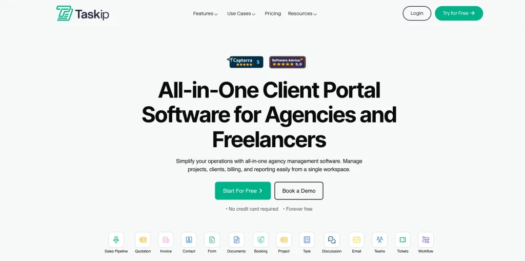 Taskip Revolutionary Client portal platform combining AI-powered automation with intuitive project tracking. Perfect for digital entrepreneurs managing multiple client projects or running platforms like ProHandy Service Marketplace.