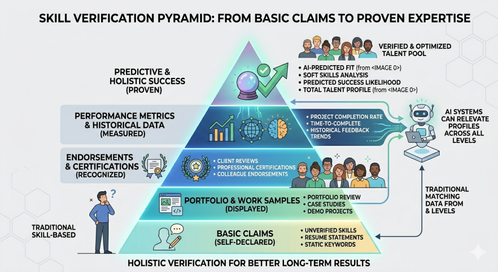 Traditional search relies on self-reported skills and basic filters. Intelligent skill-based matching systems verify abilities, analyze work history patterns, and learn from every successful (and unsuccessful) pairing.